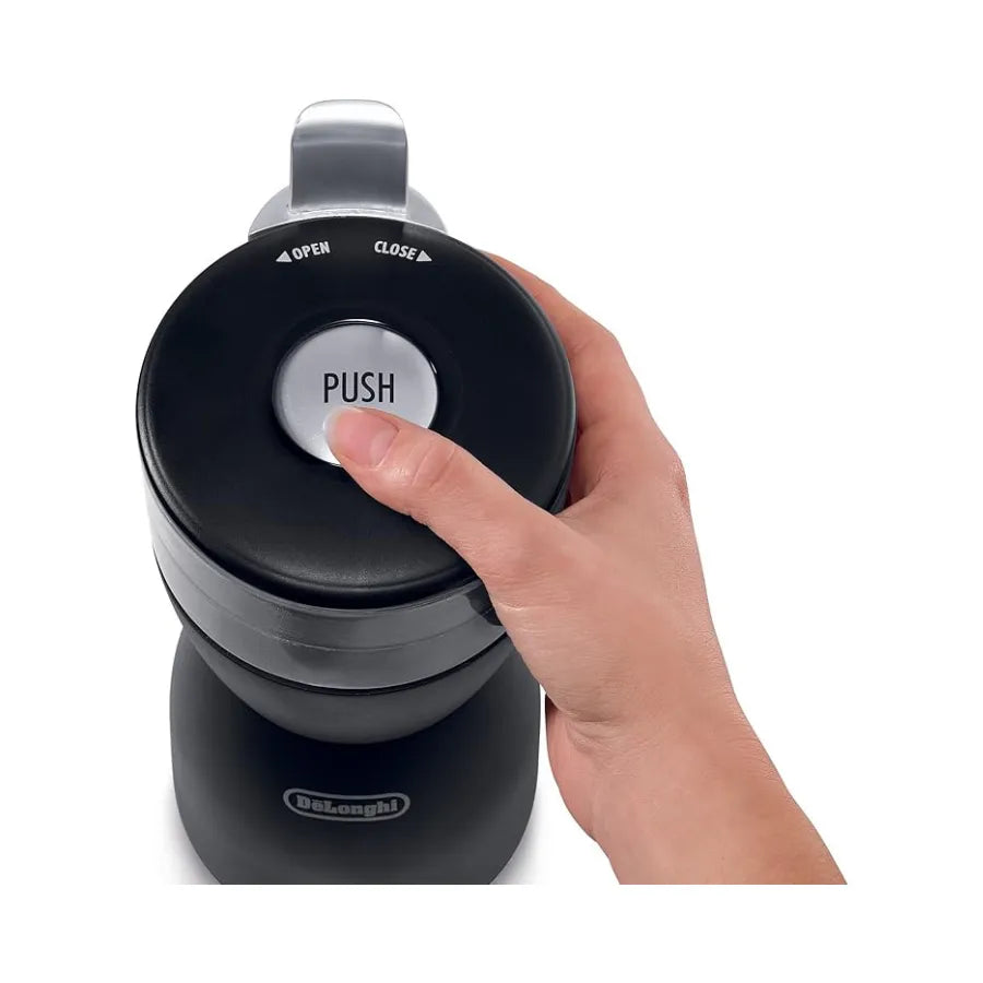 The DELONGHI KG40 electric coffee grinder is designed to grind coffee beans quickly while preserving their natural aroma and flavor. It features durable stainless steel blades and a simple Push to Grind system that allows easy grinding by pressing the lid during operation.